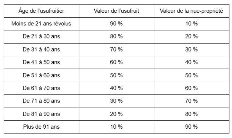 Les évaluations d’usufruit et nue-propriété reposent sur le barème fiscal défini à l’article 669 du (CGI).